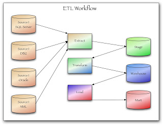 ETL, or Extract, Transform and Load, eases the combination of heterogeneous sources into a unified central repository. Usually this repository is a data warehouse or mart which will support enterprise business intelligence.