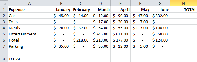How about totaling every row and column in 2 mouse clicks? Simply highlight the entire table, including the blank Total row and column, then click the AutoSum Symbol located at the top-right of the Menu bar. The symbol looks like this: ![]()