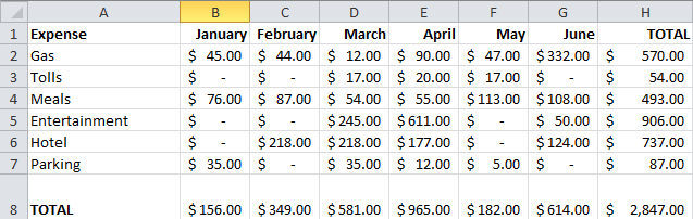 The most basic function of Excel is to add columns and rows of numbers. When creating a sheet like the one below, most users will enter the addition formula in one cell and copy that formula to the other cells — once for the rows and once for the column totals.