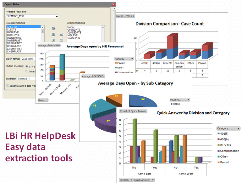 Whether HR is simply interested in standard reports, basic Excel pivot tables and charts, or you decide to take the plunge and create beautiful multi-point 3-D graphics in Tableau, LBi HR Help Desk collects and organizes the key data HR demands.